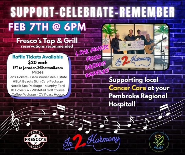A night of live music, food specials, amazing raffle prizes to be drawn, 50/50 at the event with ALL proceeds going to the Pembroke Regional Hospital Foundation – Cancer Care Campaign.