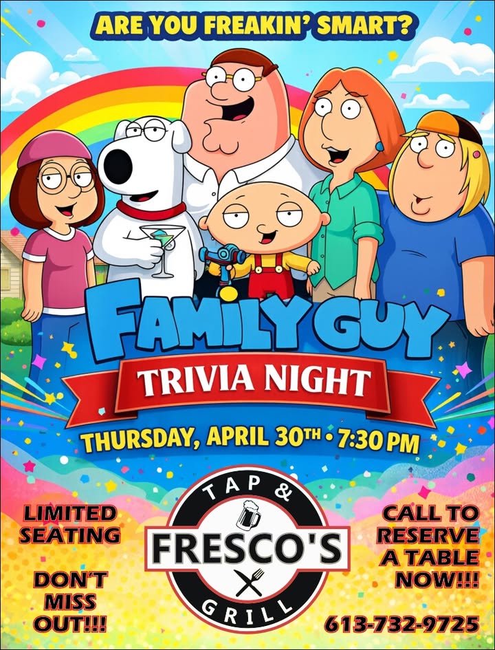 Stewie-level chaos, Peter-level confidence, and just enough brainpower to not end up like Quagmire in a bad decision spiral … It’s Family Guy Trivia Night at Fresco’s hosted by DJ Chris Cooper of CCDJ Events! ![]()